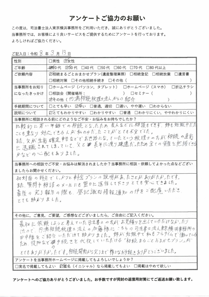 - 今回は本当にお世話になりました。お会いしたのが1回だけだったので、最初は不安でしたが、こまめにメール下さり、あっという間に手続が済んだので、とても驚きました。スムーズに名義変更できたことを大変感謝しています。また何かあった時はお願いします。ありがとうございました。