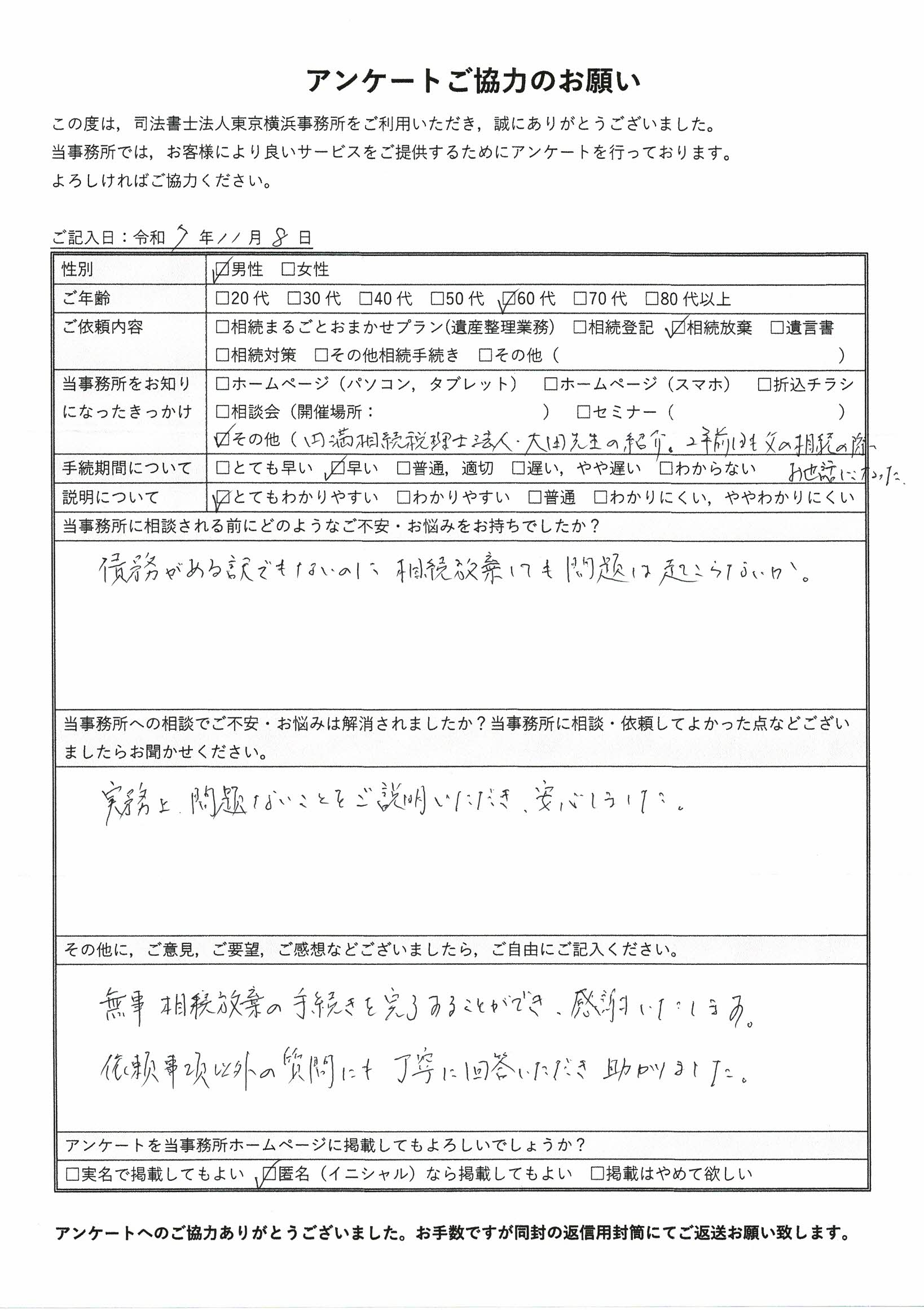 無事、相続放棄の手続きを完了することができ、感謝いたします。(O.H様 神奈川県相模原市 60代男性)