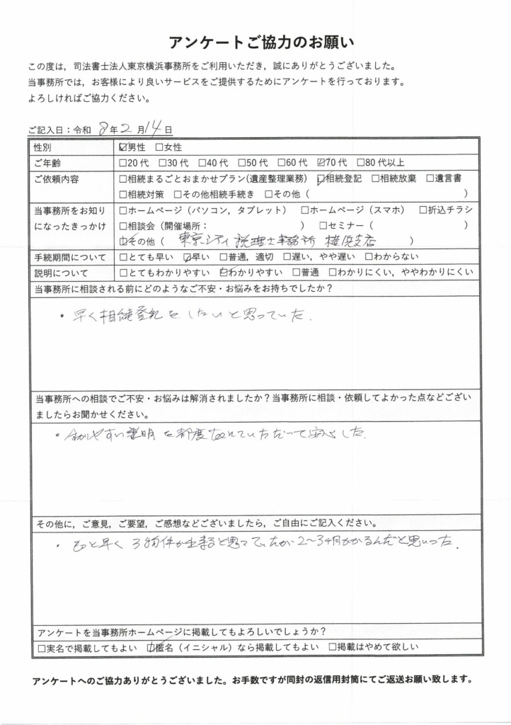 わかりやすい説明を都度TELにていただいて安心した。(F.Y様 神奈川県横浜市旭区 70代男性)